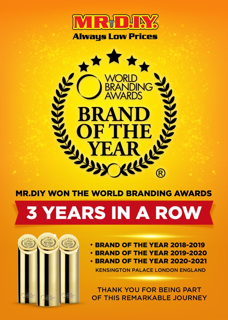 กรุงเทพฯ, 22 ธันวาคม 2563 – มิสเตอร์. ดี.ไอ.วาย. ผู้ค้าปลีกสินค้าตกแต่งและบูรณะบ้านรายใหญ่จากประเทศมาเลเซีย ได้รับรางวัล World Branding Awards ในหมวดหมู่ผู้ค้าปลีกสินค้าตกแต่ง และบูรณะบ้าน ประจำปี 2020 – 2021 โดยมิสเตอร์. ดี.ไอ.วาย. ได้รับรางวัลอันทรงเกียรติติดต่อกันเป็นปีที่ 3