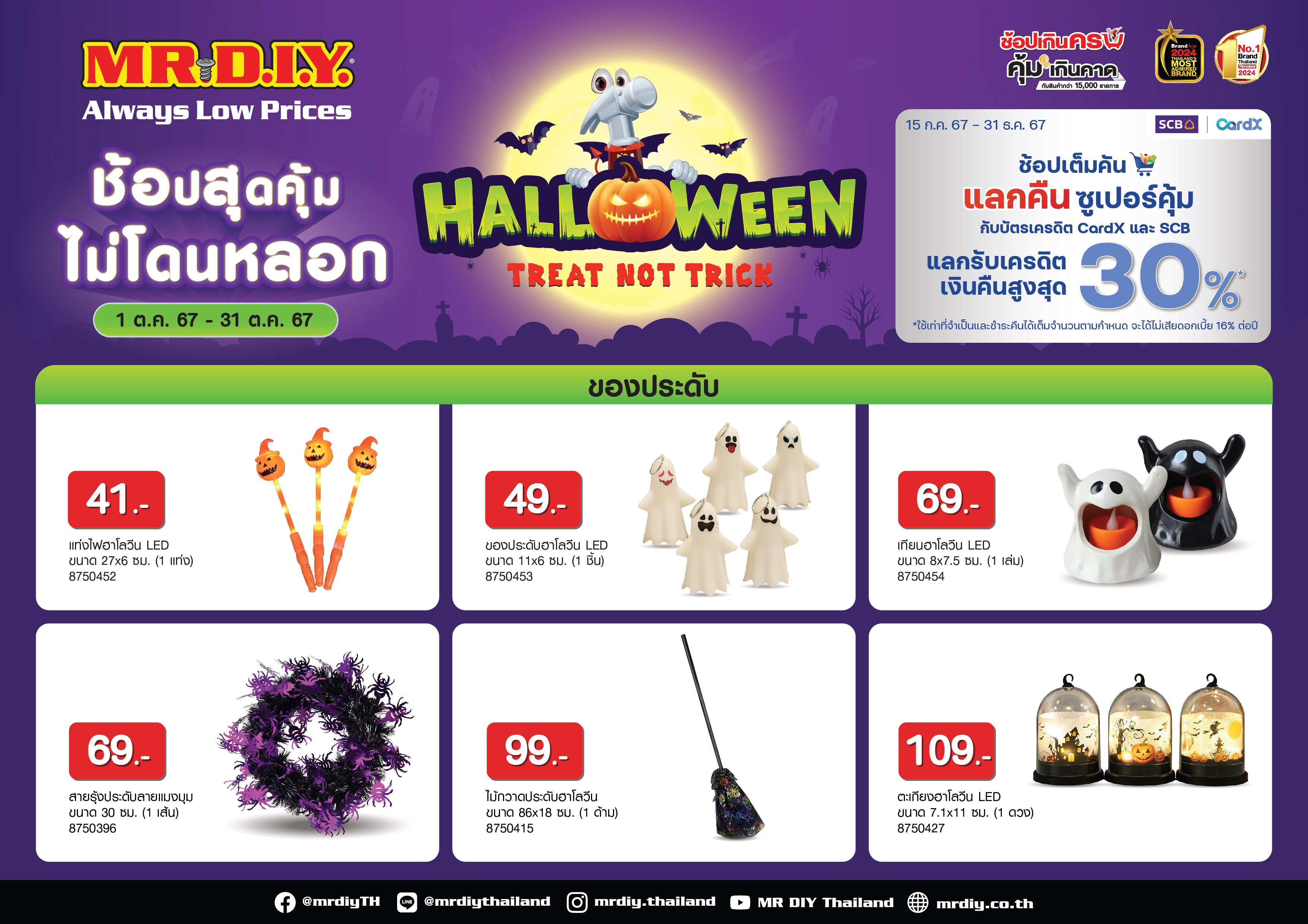 พิเศษสำหรับลูกค้าบัตรเครดิต SCB และ CardX รับสิทธิ์แลกรับเครดิตเงินคืนสูงสุดถึง 30%** ตลอดเดือนตุลาคม 2567 เมื่อช้อปสินค้าเทศกาลฮาโลวีน “Halloween Treat not Trick” ช้อปสุดคุ้ม ไม่โดนหลอก หรือสินค้าอื่นๆ ภายในร้าน มิสเตอร์. ดี.ไอ.วาย. กว่า 800 สาขาทั่วประเทศ มาร่วมสนุกและเตรียมตัวฉลองฮาโลวีนในปีนี้ไปพร้อมกัน