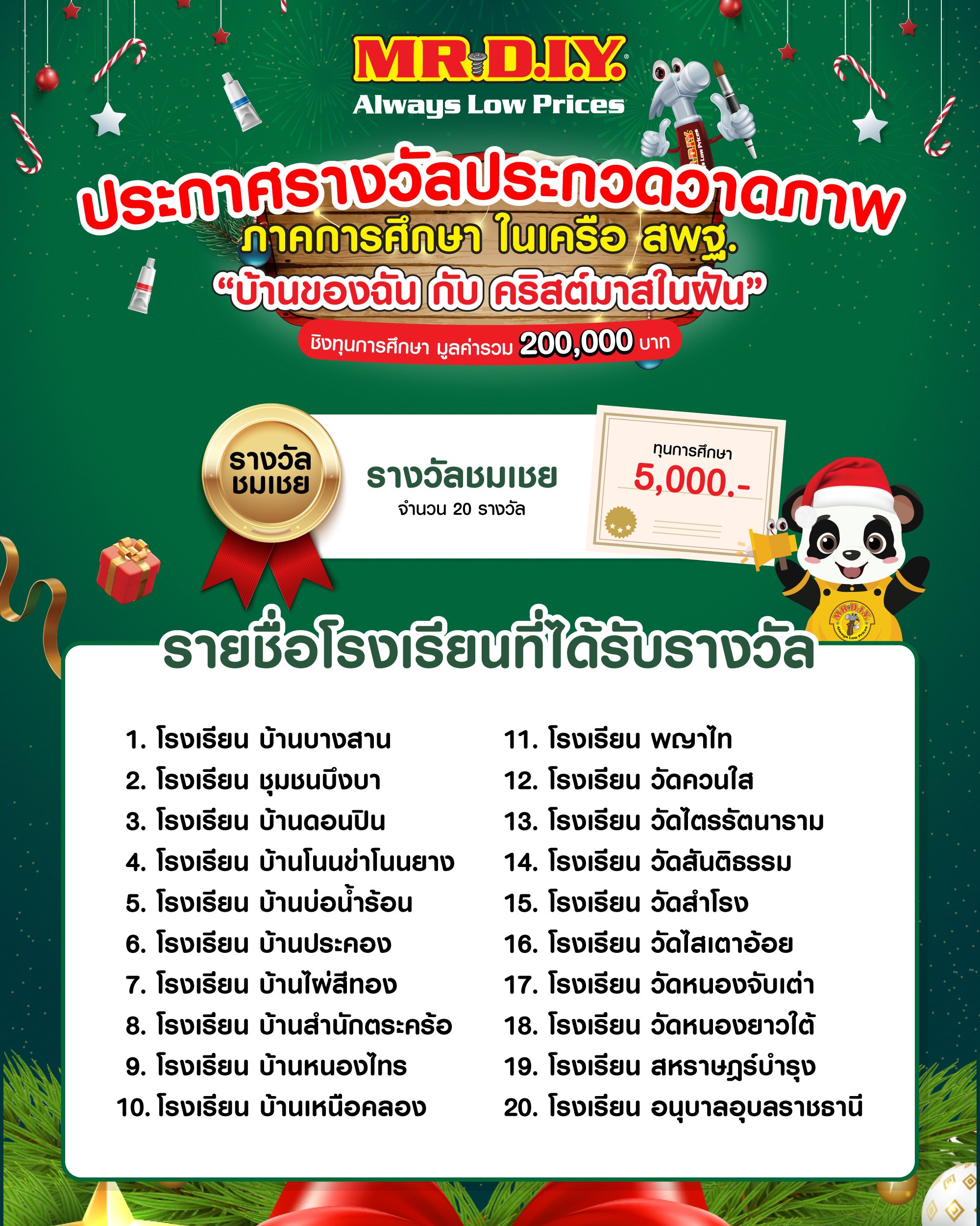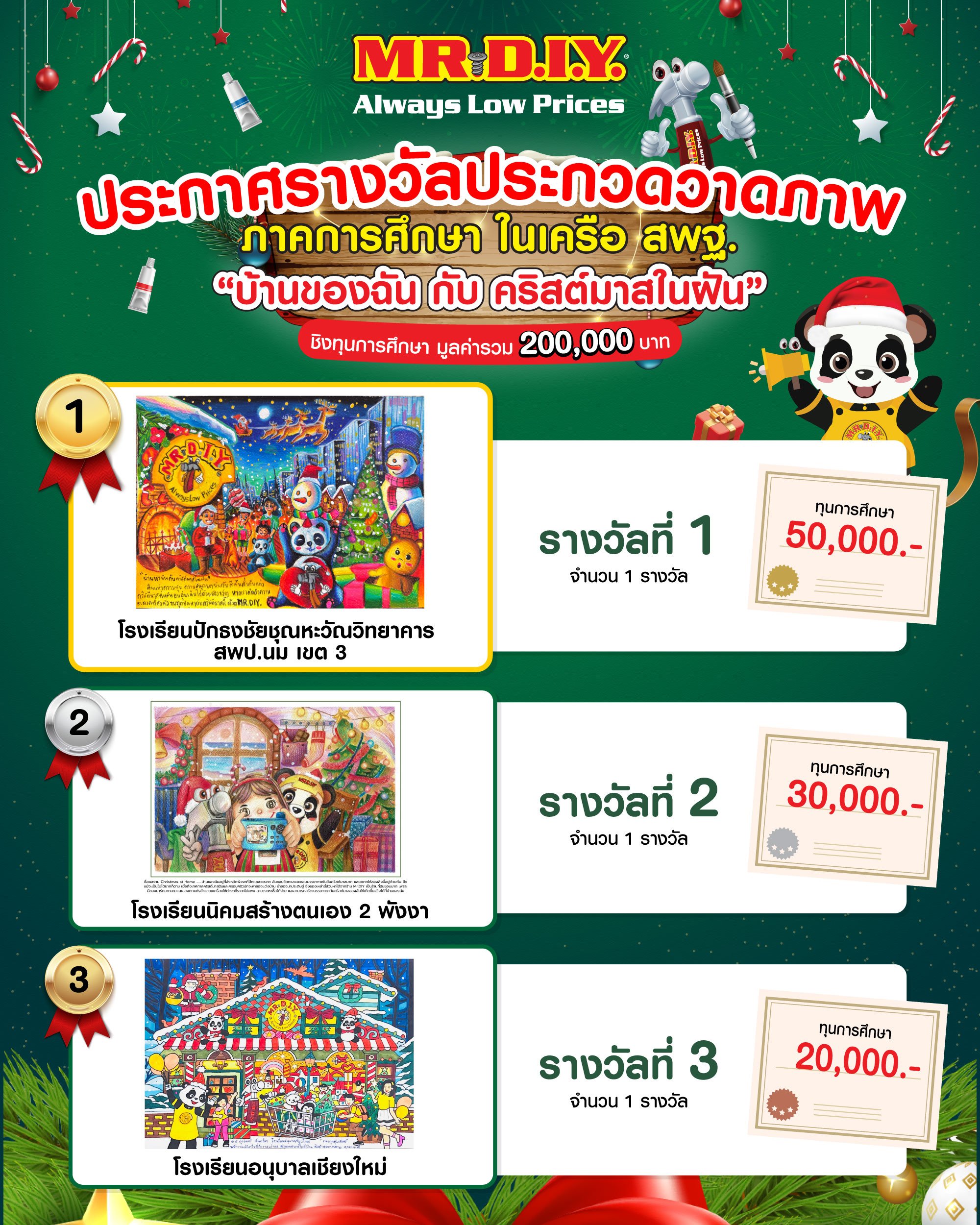 มิสเตอร์. ดี.ไอ.วาย. จัดประกวดวาดภาพระบายสี ในหัวข้อ “บ้านของฉัน กับคริสต์มาสในฝัน” แก่นักเรียนที่อายุระหว่าง 6 - 11 ปี ศึกษาอยู่ในระดับประถมศึกษา ปีที่ 1 ถึง 6 โรงเรียนอยู่ในสังกัดของ สำนักงานการศึกษาขั้นพื้นฐาน (สพฐ.) เพื่อชิงทุนการศึกษา รวมมูลค่า 200,000 บาท ในระหว่างวันที่ 1 พฤศจิกายน พ.ศ. 2567 – 16 ธันวาคม พ.ศ. 2567 โดยไม่เสียค่าสมัครหรือค่าใช้จ่ายใดๆ ทั้งสิ้น