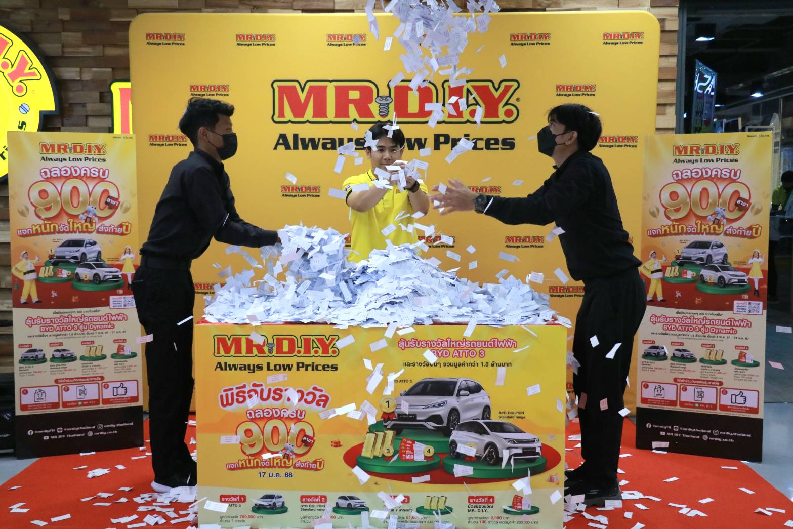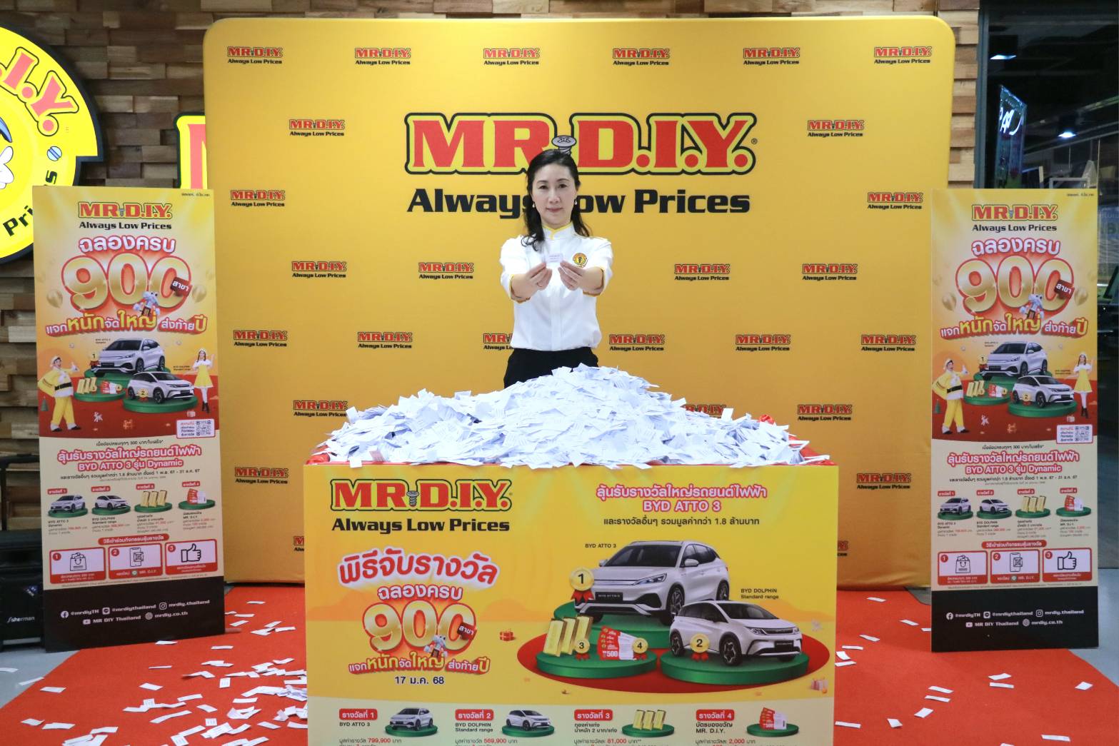 ในพิธีจับรายชื่อได้แบ่งการจับเป็นผู้โชคดีตัวจริง และตัวสำรองในแต่ละรางวัลจำนวน 105 รางวัล มูลค่ารวม 1.8 ล้านบาท โดยมีรายชื่อที่ได้รับรถยนต์ไฟฟ้า รุ่น BYD Atto 3 Dynamic มูลค่ารางวัลละ 799,900 บาท จำนวน 1 รางวัล รถยนต์ไฟฟ้า รุ่น BYD Dolphin standard range มูลค่ารางวัลละ 569,900 บาท จำนวน 1 รางวัล ทองคำแท่ง น้ำหนัก 2 บาท/แท่ง มูลค่ารางวัลละ 81,000 บาท* จำนวน 3 รางวัล และบัตรของขวัญ มิสเตอร์. ดี.ไอ.วาย. มูลค่ารางวัลละ 2,000 บาท จำนวน 100 รางวัลโดยสามารถตรวจสอบรายชื่อผู้โชคดีได้ที่: https://bit.ly/900thStoreCelebration_Announcement