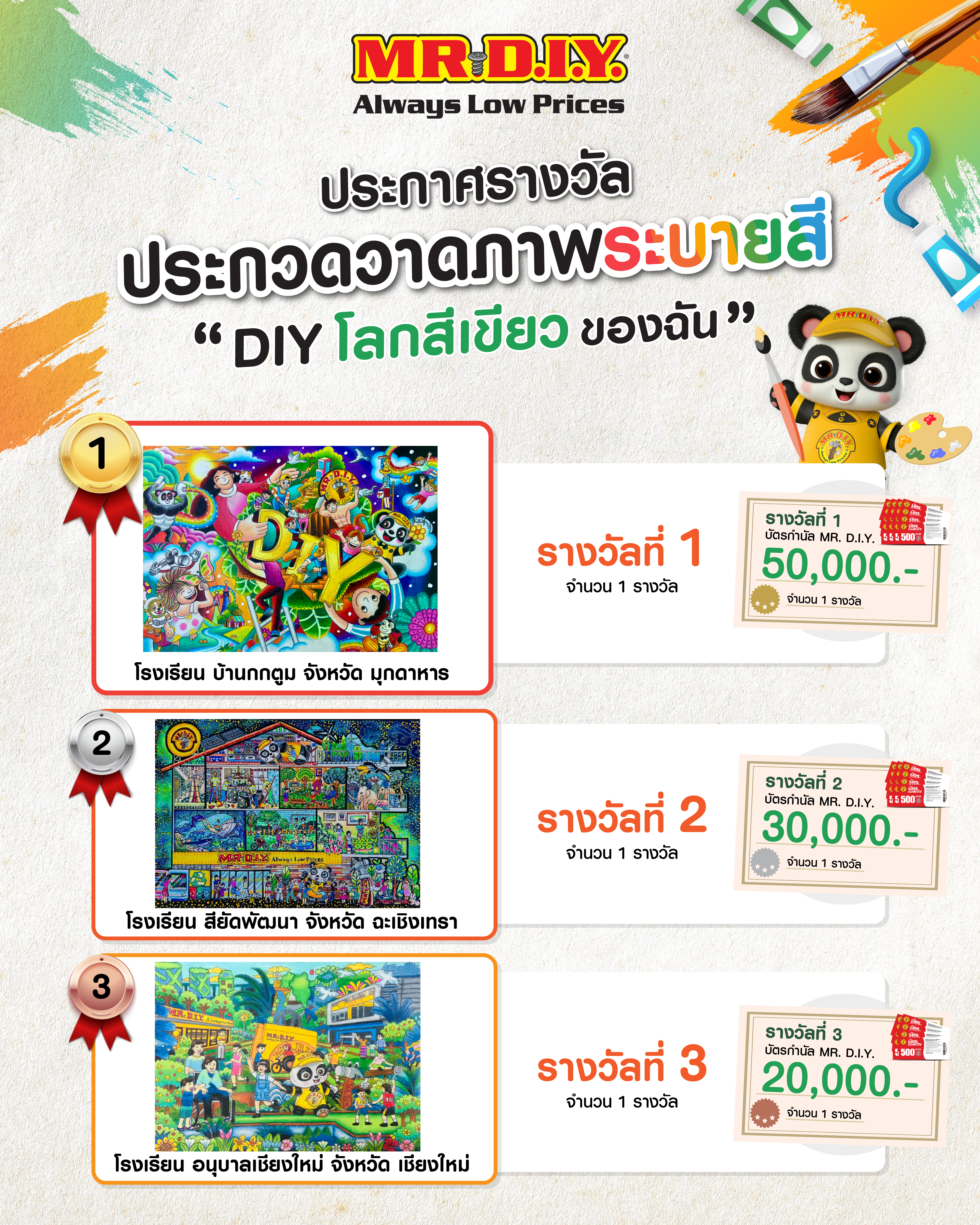 - ผลงานการวาดภาพพร้อมระบายสี ต้องเป็นไปตามหัวข้อที่บริษัทฯ กำหนด คือ “DIY โลกสีเขียวของฉัน” โดยจะต้องวาดภาพ DIY Panda mascot และ MR.DIY Hammer mascot ลงในผลงาน ขนาด 8.3 นิ้ว x 11.7 นิ้ว (กระดาษ A4 แนวนอน) เท่านั้น พร้อมคำบรรยายด้านหลังผลงาน