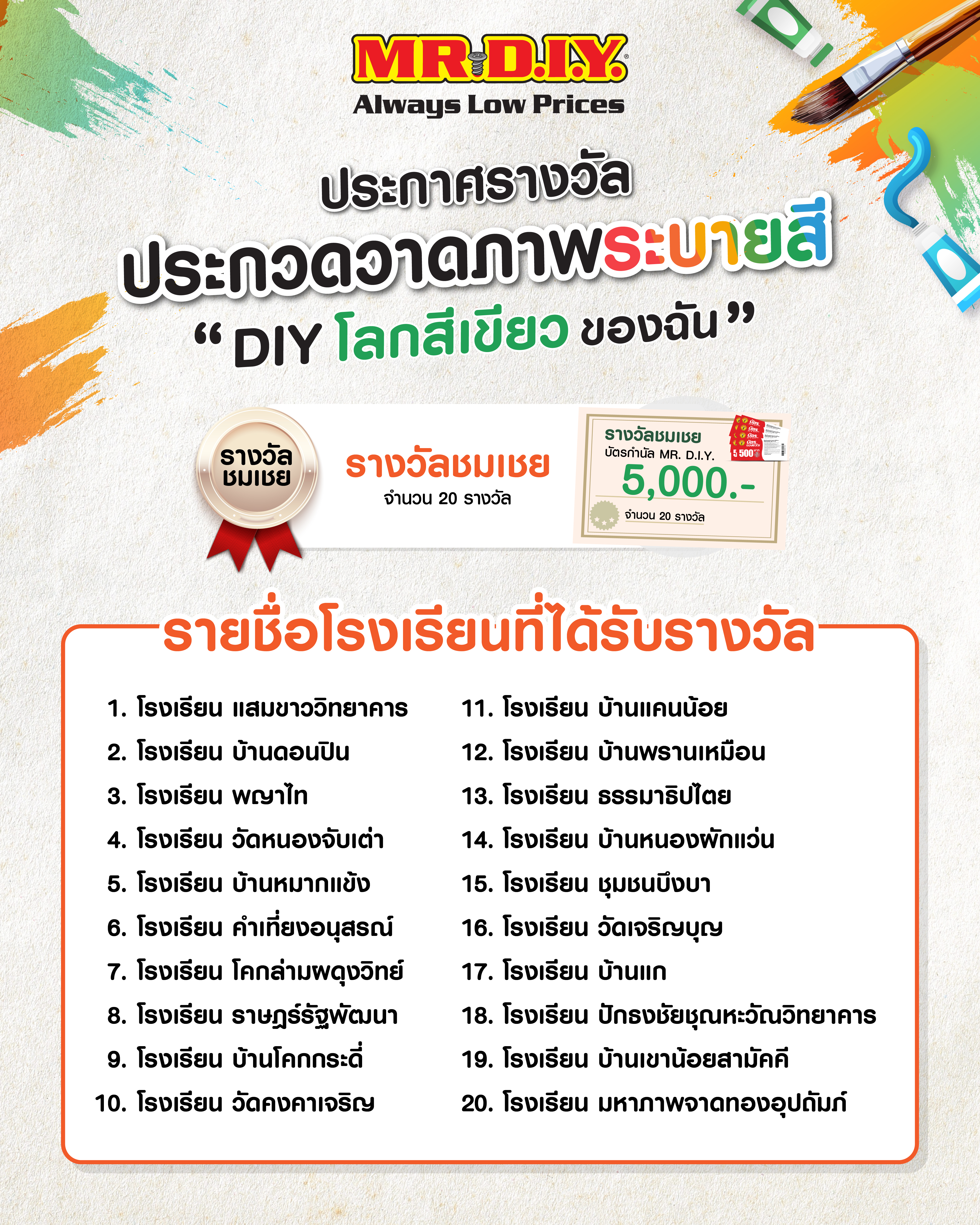 - รางวัลชมเชย 5,000 บาท จำนวน 20 รางวัล