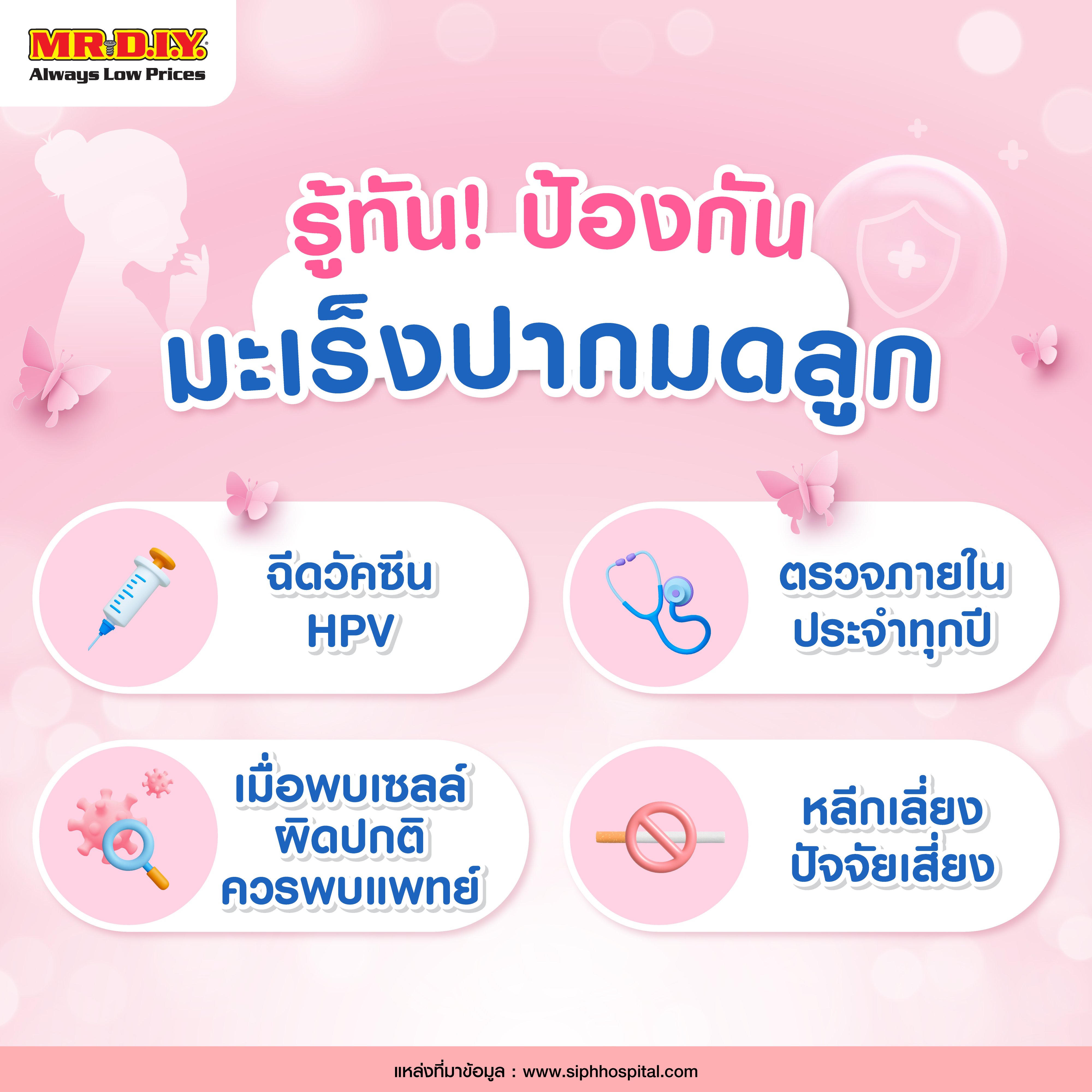 มะเร็งปากมดลูกเป็นโรคที่ป้องกันได้หากมีการดูแลสุขภาพที่เหมาะสม โดย การฉีดวัคซีน HPV, ตรวจคัดกรองเป็นประจำ และลดปัจจัยเสี่ยง เป็นวิธีที่มีประสิทธิภาพในการลดความเสี่ยงของโรคนี้ อย่ารอให้สายเกินไป หมั่นดูแลสุขภาพของคุณตั้งแต่วันนี้ เพื่อชีวิตที่ปลอดภัยจากมะเร็งปากมดลูก