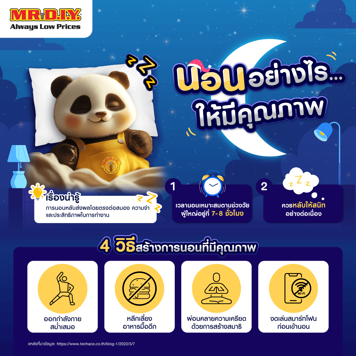 การนอนหลับที่ดีไม่ได้ขึ้นอยู่กับระยะเวลาเพียงอย่างเดียว แต่ยังต้องคำนึงถึงคุณภาพของการนอนด้วย MR. D.I.Y. ขอแนะนำให้ทุกคนใส่ใจในพฤติกรรมก่อนนอนและปรับเปลี่ยนสภาพแวดล้อมให้เอื้อต่อการพักผ่อน เพื่อสุขภาพที่ดีในระยะยาว