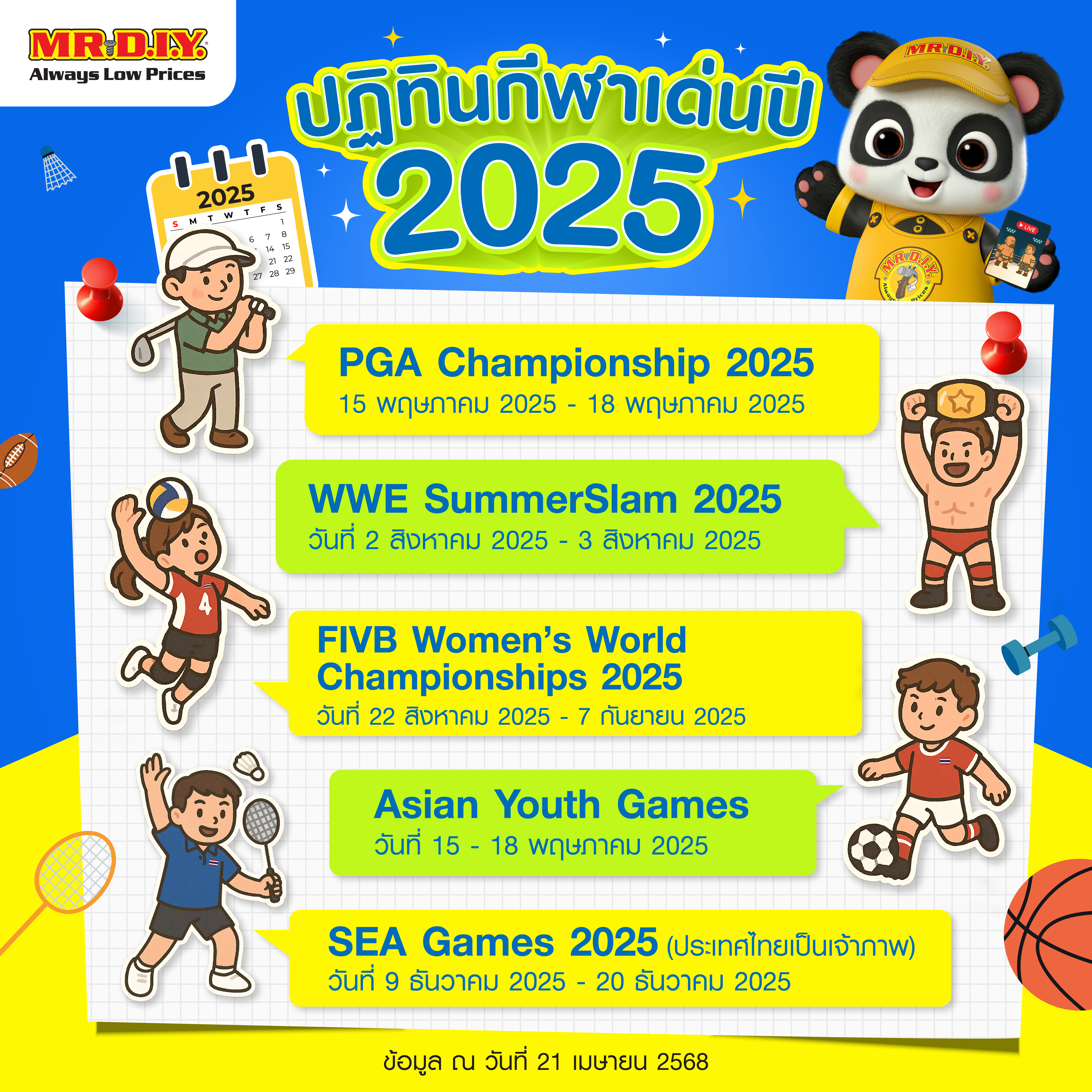 ปี 2025 เป็นปีที่คนรักกีฬา และสายเชียร์ต้องตั้งตารอ เพราะตลอดทั้งปีมีกิจกรรมกีฬาระดับโลกและระดับภูมิภาคแบบจัดเต็ม ไม่ว่าจะเป็นกอล์ฟรายการเมเจอร์ มวยปล้ำระดับอินเตอร์ วอลเลย์บอลหญิงชิงแชมป์โลก หรือแม้แต่ SEA Games ที่ปีนี้ประเทศไทยเป็นเจ้าภาพ!
