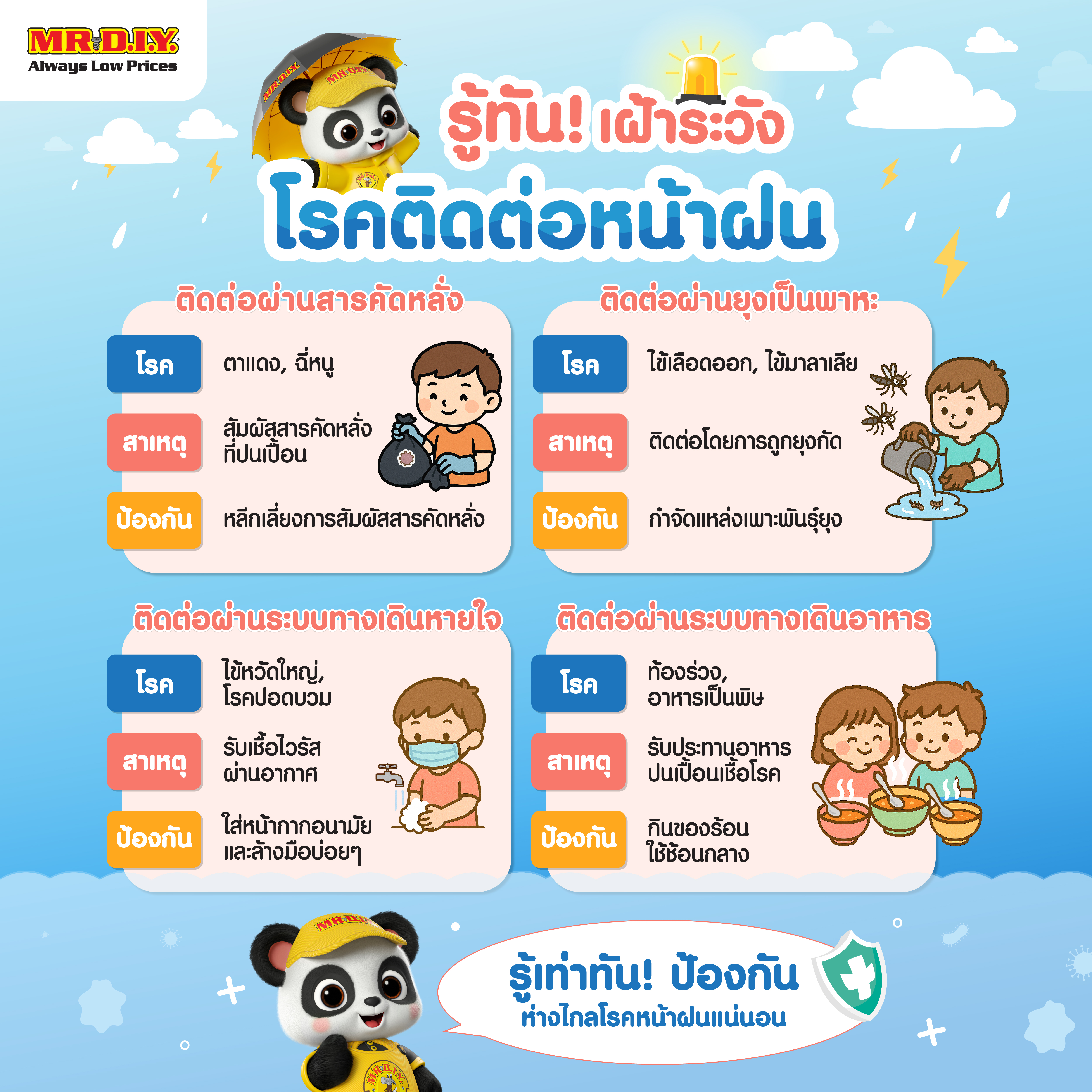 เพื่อให้ทุกคนในครอบครัวปลอดภัยจากโรคต่าง ๆ ที่มากับฤดูฝน เราขอชวนคุณมา รู้ทัน! เฝ้าระวัง และป้องกันโรคติดต่อหน้าฝน อย่างถูกวิธี