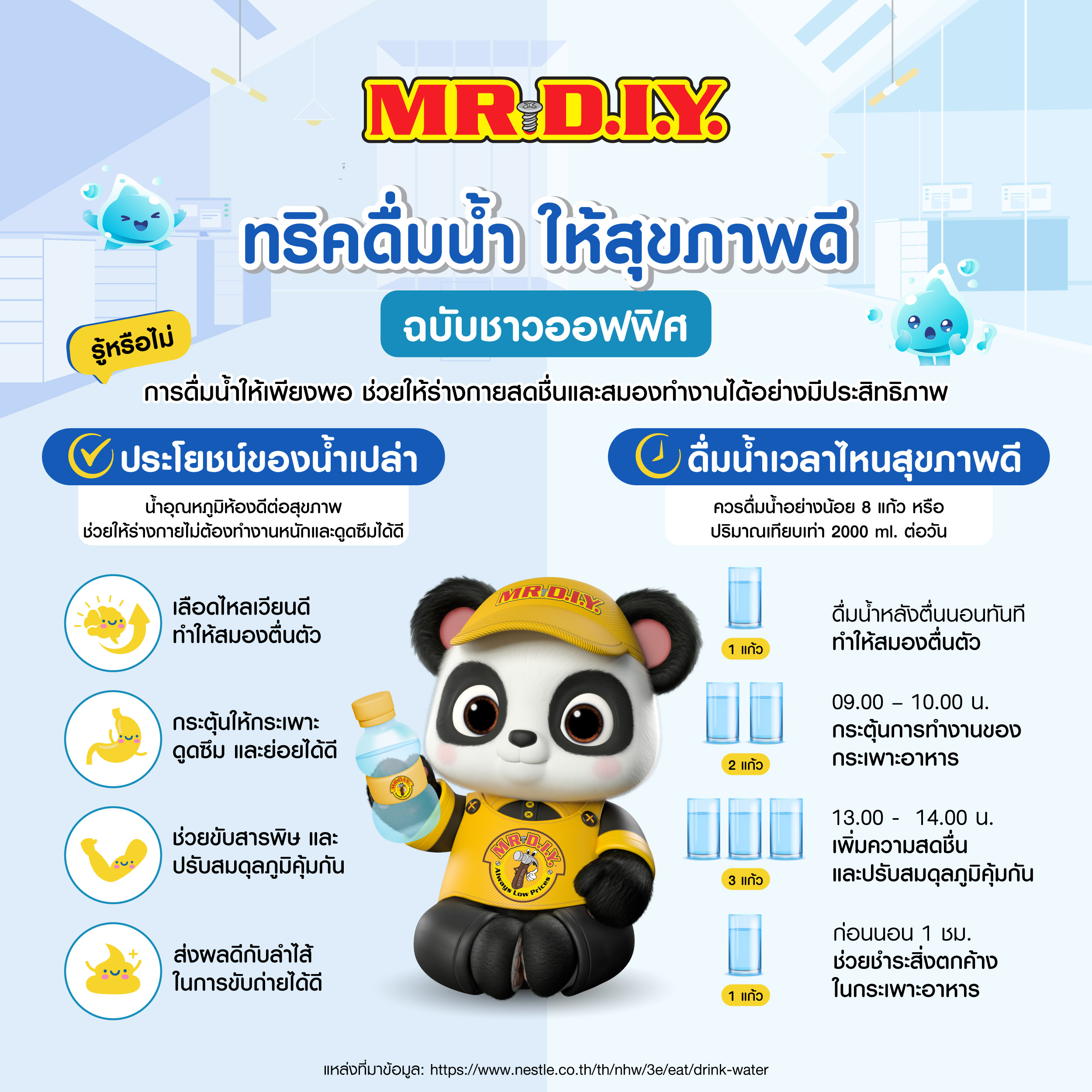 การดื่มน้ำให้เพียงพอและถูกเวลา ไม่เพียงแต่ช่วยให้คุณ มีสุขภาพดี แต่ยังทำให้ สมองปลอดโปร่ง มีสมาธิ และทำงานได้อย่างมีประสิทธิภาพ เหมาะสำหรับชาวออฟฟิศที่ต้องนั่งทำงานนาน ๆ ลองนำทริคเหล่านี้ไปปรับใช้ในชีวิตประจำวัน แล้วคุณจะสัมผัสได้ถึงความเปลี่ยนแปลงที่ดีขึ้นแน่นอน และถ้าอยากให้การดื่มน้ำสนุกและง่ายขึ้น MR. D.I.Y. มีตัวช่วยดี ๆ รอคุณอยู่ ไม่ว่าจะเป็น