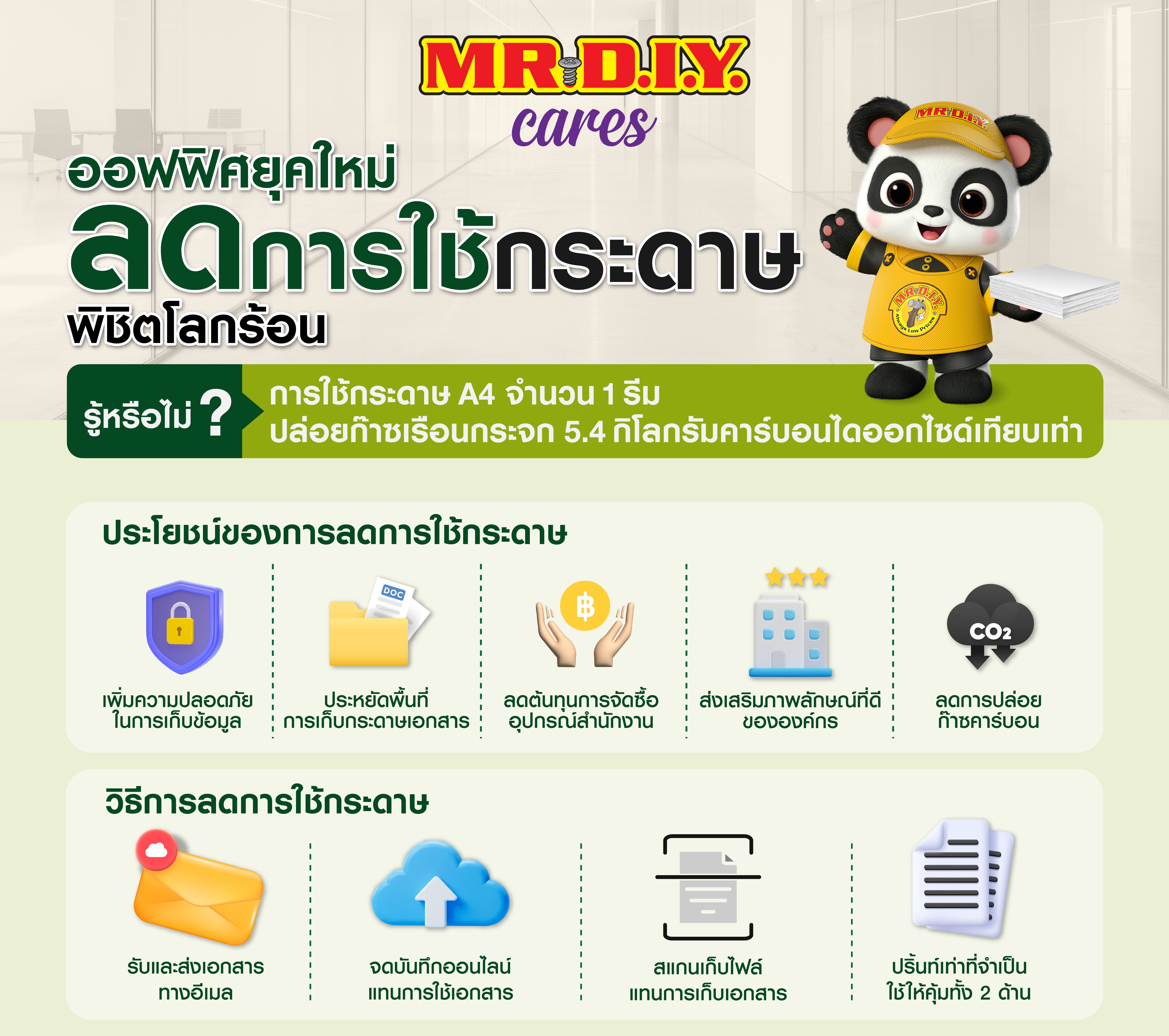 คุณรู้หรือไม่? เพียงการใช้กระดาษ A4 จำนวน 1 รีม (500 แผ่น) สามารถปล่อยก๊าซเรือนกระจกมากถึง 5.4 กิโลกรัมคาร์บอนไดออกไซด์เทียบเท่า ซึ่งเป็นตัวการสำคัญที่ทำให้เกิดภาวะโลกร้อน หากเราทุกคนเริ่มต้นลดการใช้กระดาษตั้งแต่วันนี้ ก็เท่ากับช่วยลดการปล่อยก๊าซเรือนกระจก และช่วยให้โลกน่าอยู่มากขึ้น