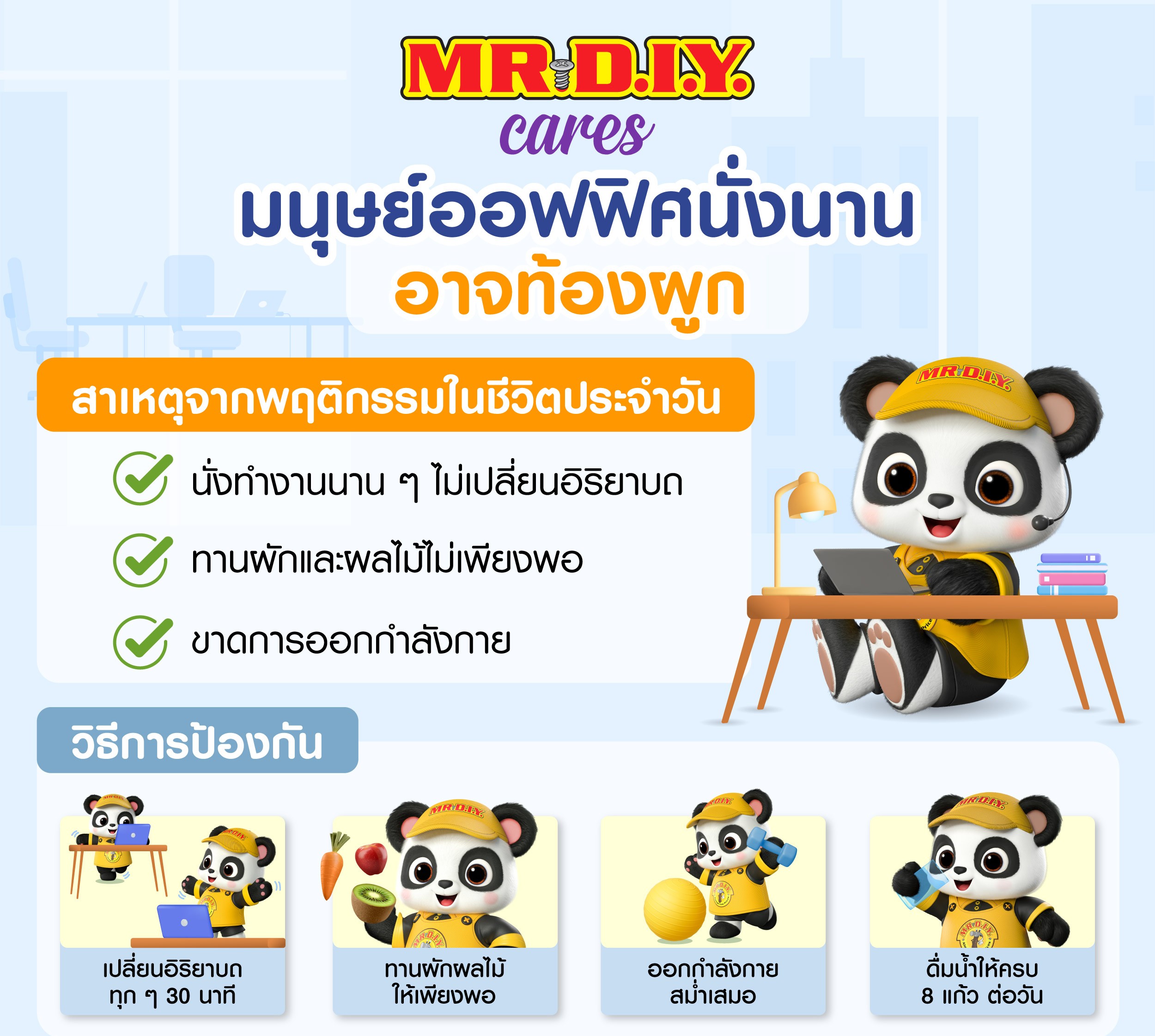 สุขภาพดีเริ่มต้นได้จากพฤติกรรมเล็ก ๆ ในแต่ละวัน มนุษย์ออฟฟิศทุกคนสามารถเริ่มได้เลยตั้งแต่วันนี้ ทั้งดื่มน้ำให้มากขึ้น ทานผักผลไม้ทุกมื้อ และหมั่นขยับร่างกายให้บ่อยขึ้น เพื่อสุขภาพที่แข็งแรง และชีวิตการทำงานที่มีประสิทธิภาพ