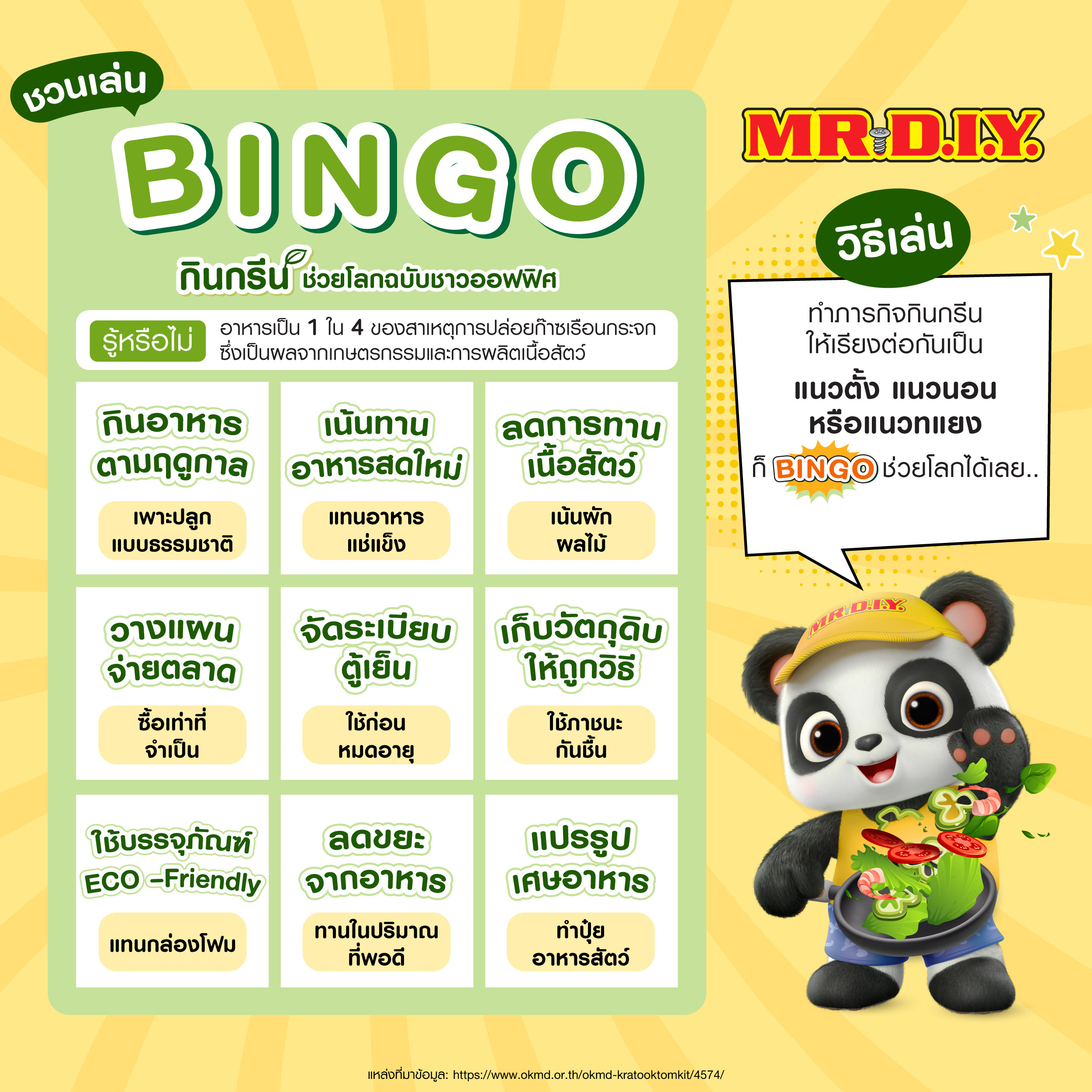 หลังจากรู้แนวทางกินกรีนกันแล้ว มาลองเล่นเกมสนุก ๆ จาก MR. D.I.Y. กันดูสิ! เพียงทำกิจกรรมกินกรีนตามช่องบิงโก ไม่ว่าจะเรียงแนวตั้ง แนวนอน หรือแนวแทยงมุม ก็ถือว่าคุณคือหนึ่งในคนที่ “กินกรีนช่วยโลก” แล้ว