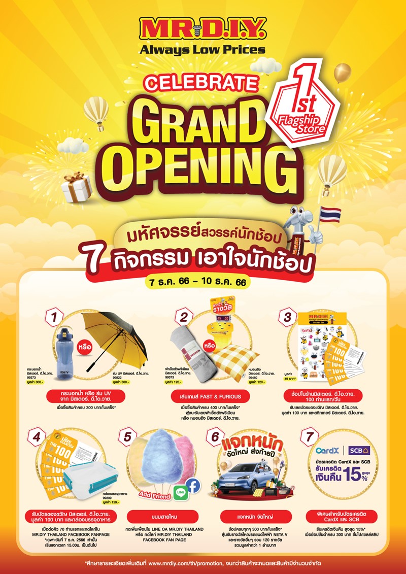 เพื่อเฉลิมฉลองอย่างยิ่งใหญ่ต้อนรับการเปิดสาขาแฟลกชิปสโตร์ หรือสาขาที่ 700 มิสเตอร์. ดี.ไอ.วาย. จัดโปรโมชันพิเศษ “มหัศจรรย์สวรรค์นักช้อป” กับ 7 กิจกรรม เอาใจนักช้อป ระหว่างวันที่ 7-10 ธันวาคม 2566 อาทิ รับกระบอกน้ำ หรือ ร่ม UV จาก มิสเตอร์. ดี.ไอ.วาย. เมื่อซื้อสินค้าครบ 300 บาท/ ใบเสร็จ* และรับบัตรของขวัญมิสเตอร์. ดี.ไอ.วาย. มูลค่า 100 บาท พร้อมสติกเกอร์มิสเตอร์. ดี.ไอ.วาย. เมื่อช้อปที่สาขาแฟลกชิปสโตร์ 100 ท่านแรก/วัน* พบกับกิจกรรมทั้งหมดนี้ที่ร้านมิสเตอร์. ดี.ไอ.วาย. สาขาแฟลกชิปสโตร์แห่งแรกในประเทศไทย ที่เดอะมอลล์ ไลฟ์สโตร์ บางกะปิ เท่านั้น