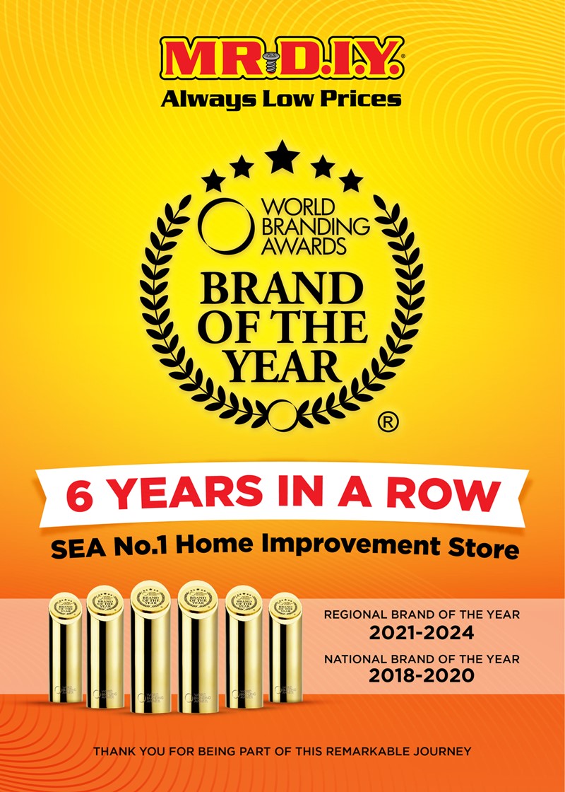 กัวลาลัมเปอร์, 18 ธันวาคม 2566 – มิสเตอร์. ดี.ไอ.วาย. ผู้นำด้านค้าปลีกสินค้าตกแต่งและซ่อมแซมบ้านรายใหญ่ในภูมิภาคเอเชียตะวันออกเฉียงใต้ คว้ารางวัล World Branding Awards อีกครั้งในประเภทรางวัล “ผู้นำแบรนด์ค้าปลีกสินค้าซ่อมแซมบ้าน” (Top Home Improvement Retail Brand) ระดับภูมิภาค (Regional Award) โดยรางวัลดังกล่าวสะท้อนถึงการเป็นผู้นำตลาดของมิสเตอร์. ดี.ไอ.วาย. ใน 4 ประเทศที่ดำเนินธุรกิจอยู่ ได้แก่ มาเลเซีย ไทย อินโดนีเซีย และฟิลิปปินส์