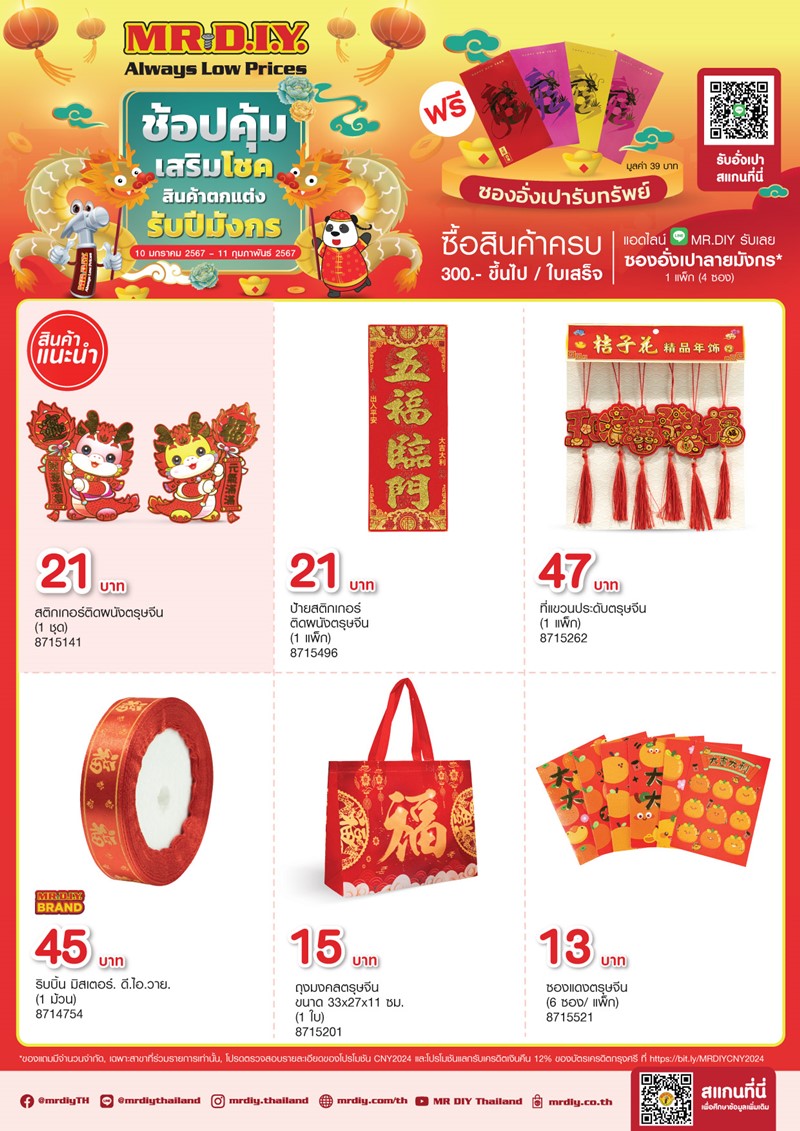 นอกจากนี้ เมื่อช้อปสินค้าตกแต่งต้อนรับเทศกาลตรุษจีน หรือสินค้าภายในร้านมิสเตอร์. ดี.ไอ.วาย. ครบ 300 บาทขึ้นไป/ใบเสร็จ* พร้อมแอดไลน์ MR.DIY รับซองอั่งเปารับทรัพย์ลายมังกร มูลค่า 39 บาท 1 แพ็ค (4 ซอง) หรือจนกว่าสินค้าจะหมด และสิทธิพิเศษกับบัตรเครดิต กรุงศรี แลกรับเครดิตเงินคืนสูงสุด 12%** เงื่อนไขเป็นไปตามบริษัทฯ และบริษัทบัตรฯ กำหนด เสริมเฮงในเทศกาลตรุษจีนได้แล้วที่ร้านมิสเตอร์. ดี.ไอ.วาย. ในกว่า 700 สาขาทั่วประเทศ ทุกทิศทั่วไทยใกล้บ้านคุณ กับหลากหลายสินค้ากว่า 15,000 รายการ ใน 10 แผนก ได้ทุกวัน และทุกเทศกาล และตลอด 24 ชั่วโมงผ่านช่องทางออนไลน์ที่ WWW.MRDIY.CO.TH หรือมิสเตอร์. ดี.ไอ.วาย. ออนไลน์สโตร์ บน Shopee Mall ผ่านการค้นหา MR.DIY Thailand Official คลิก https://bit.ly/3hrVo7F