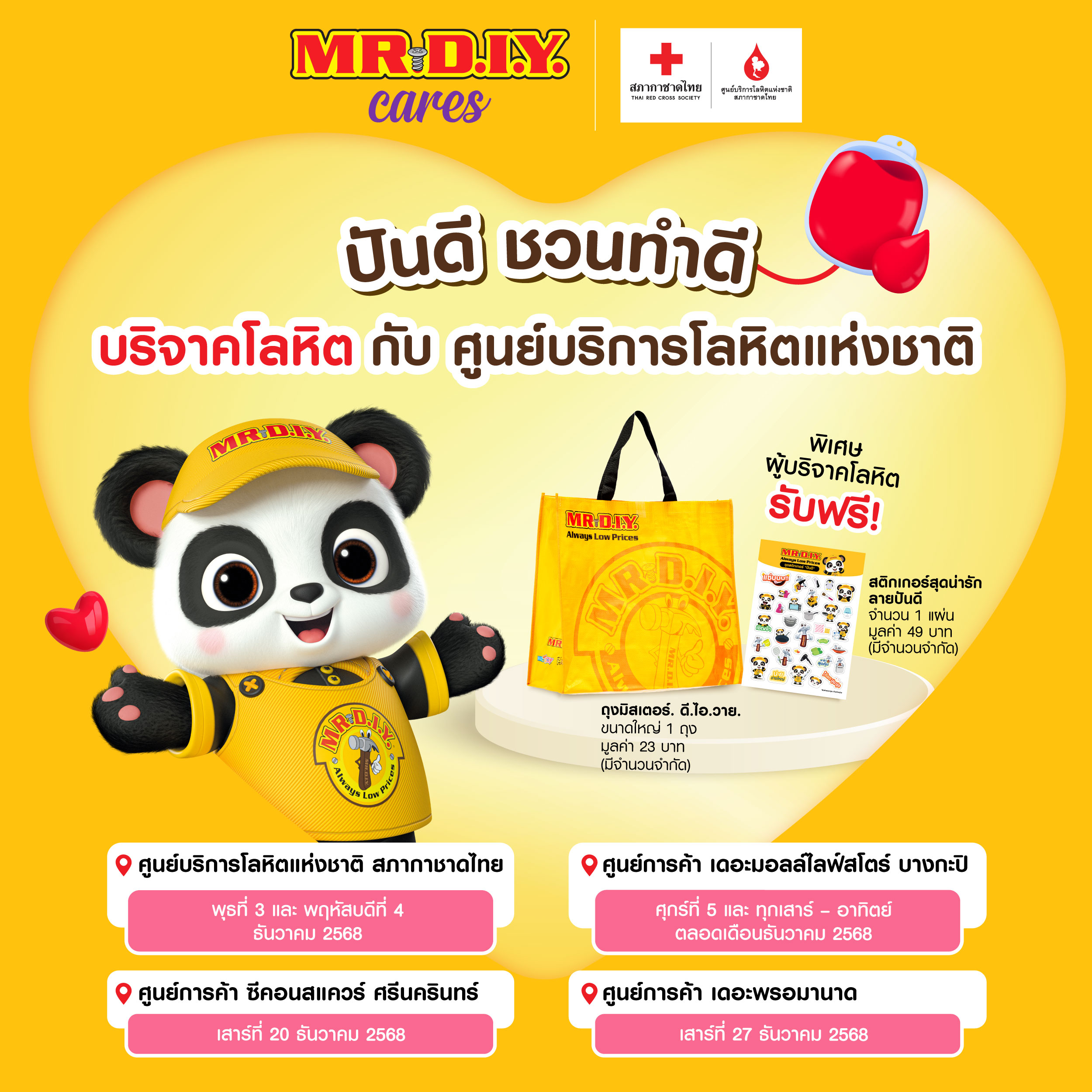 รวมถึงการจัดกิจกรรม “Troop เจอดีทั่วไทย ปันความสุขส่งท้ายปี”(5) พร้อมชวนทำดีบริจาคโลหิต” ร่วมกับสภากาชาดไทย(2) นำโดยมาสคอต “ปันดี” ที่เตรียมมอบรอยยิ้มไปสู่ลูกค้าในหลายพื้นที่ทั่วกรุงเทพฯ พร้อมกิจกรรมสนุก ๆ อีกมากมายและพิเศษสุดในช่วงวันที่ 20–28 ธันวาคม 2568 เพียงซื้อสินค้าใดก็ได้ครบ 300 บาท/ใบเสร็จ จะได้รับ ถุงชอปปิง MR. D.I.Y. ขนาดใหญ่ (L) มูลค่า 23 บาท ฟรี! จำกัด 100 ท่านแรกต่อวันต่อสาขา ใน 25 สาขา ในห้างสรรพสินค้าและซุปเปอร์มาร์เก็ตชั้นนำที่ร่วมรายการ(6)