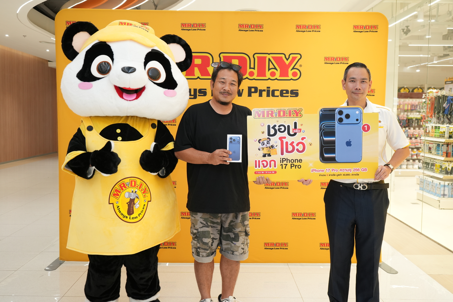 โดยกิจกรรมดังกล่าวจัดขึ้นระหว่างวันที่ 1 กันยายน 2568 – 31 ตุลาคม 2568 ที่ผ่านมา ซึ่งได้รับการตอบรับเป็นอย่างดีจากลูกค้ามิสเตอร์. ดี.ไอ.วาย. ในกว่า 1,000 สาขา ทั่วประเทศไทย แจก iPhone 17 Pro 5 เครื่อง พร้อมของรางวัลรวม 205 รางวัล(1) รวมมูลค่าของรางวัล 619,500 บาท