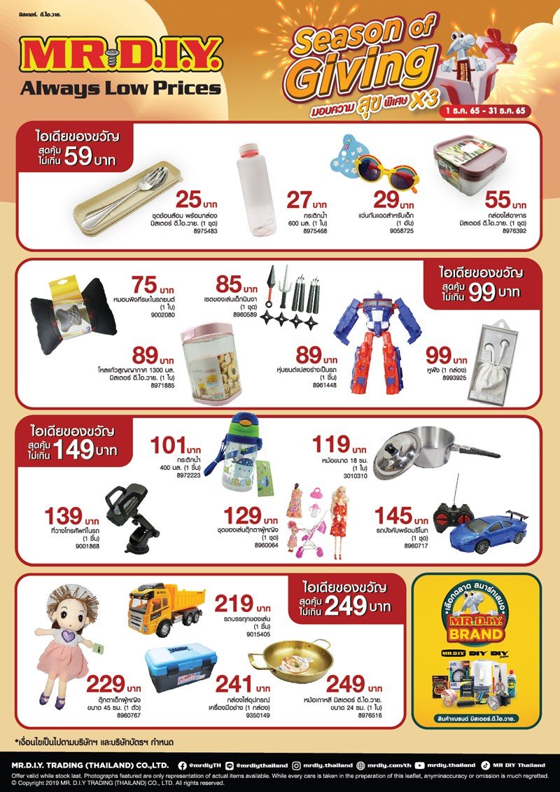 สุขให้สุดกับเทศกาลแห่งการให้ส่งท้ายปีที่ มิสเตอร์. ดี.ไอ.วาย. กับแคมเปญ “Season of Giving มอบความสุขพิเศษ X3” สุขที่ 1 พบกับไอเดียของขวัญราคาประหยัดสุดคุ้ม ที่คัดสรรมาให้เลือกซื้อในราคาไม่เกิน 59 บาท, 99 บาท, 149 บาท, และ 249 บาท พร้อมสินค้าสำหรับตกแต่งช่วงเทศกาลคริสต์มาสอีกมากมายหลายรายการ ต่อด้วยสุขที่ 2 ลุ้นโชคใหญ่ทองคำหนัก 5 บาทและรางวัลอื่นๆ อีกกว่า 70 รางวัล สำหรับการซื้อสินค้าทุกๆ 300 บาทขึ้นไป และสุดท้ายกับสุขที่ 3 รับเครดิตเงินคืนกับบัตรเครดิต กรุงศรี ด้วยการแลกพอยต์รับเครดิตเงินคืน 12%* เมื่อมียอดช้อปครบ 500 บาทขึ้นไปต่อใบเสร็จ และแลก 500 พอยต์ผ่าน แอปพลิเคชัน UCHOOSE เพื่อรับเครดิตเงินคืน 60 บาท โดยแลกภายในวันที่ใช้จ่าย ทั้งนี้ เงื่อนไขเป็นไปตามบริษัทฯ และบริษัทบัตรฯ กำหนด