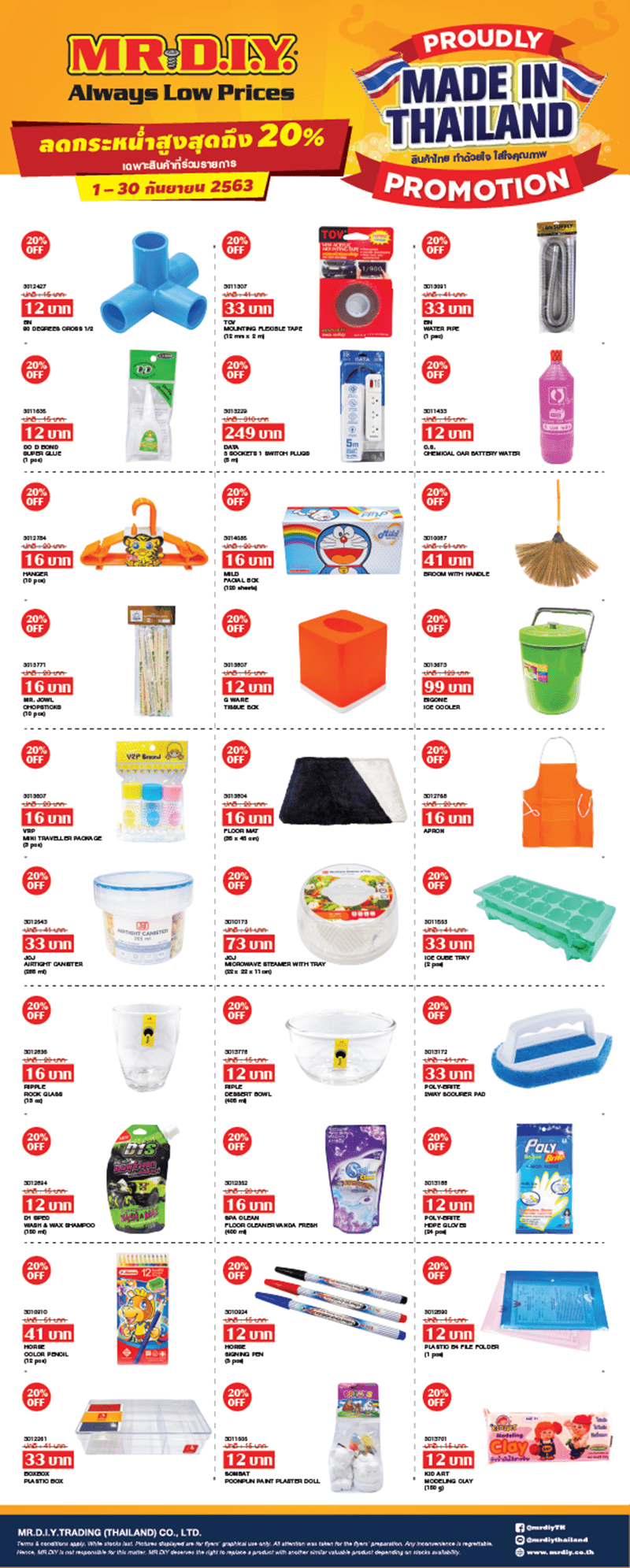 กรุงเทพ ฯ – 1 กันยายน 2563 -- มิสเตอร์. ดี.ไอ.วาย. ยกขบวนสินค้าคุณภาพของไทย ลดสุดคุ้มตลอดเดือนกันยายนในแคมเปญ Proudly made in Thailand “สินค้าไทย ทำด้วยใจ ใส่ใจคุณภาพ” ที่นำสินค้าจากผู้ผลิตในประเทศไทย มาลดเอาใจสาวกนักช้อปกว่า 30 รายการ ไม่ว่าจะเป็น ไม้แขวนเสื้อ แก้วน้ำ แฟ้มเอกสารพลาสติก ผ้ากันเปื้อน และอื่น ๆ อีกมากมาย จากหลากหลายหมวดหมู่ พลาดไม่ได้กับโปรโมชั่น Proudly Made in Thailand ที่ ร้านมิสเตอร์. ดี.ไอ.วาย. ทุกสาขาทั่วประเทศ ตั้งแต่วันนี้ – 30 กันยายน 2563