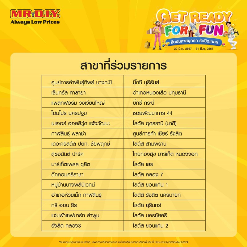 7.กรณีมีข้อพิพาท การพิจารณาและการตัดสินของบริษัทฯ ถือเป็นที่สิ้นสุด <ย>หากมีข้อสงสัย หรือสอบถามเพิ่มเติมเกี่ยวกับรายการส่งเสริมการขายนี้ กรุณาติดต่อ ฝ่ายลูกค้าสัมพันธ์ 02-136-7401 สามารถเข้าเยี่ยมชมได้ที่ Facebook: @mrdiyTH, Instagram: @mrdiy.thailand, Tiktok: @mrdiy.thailand, Line: @mrdiythailand, LinkedIn: MR.DIY Thailand, และ YouTube: MR DIY Thailand