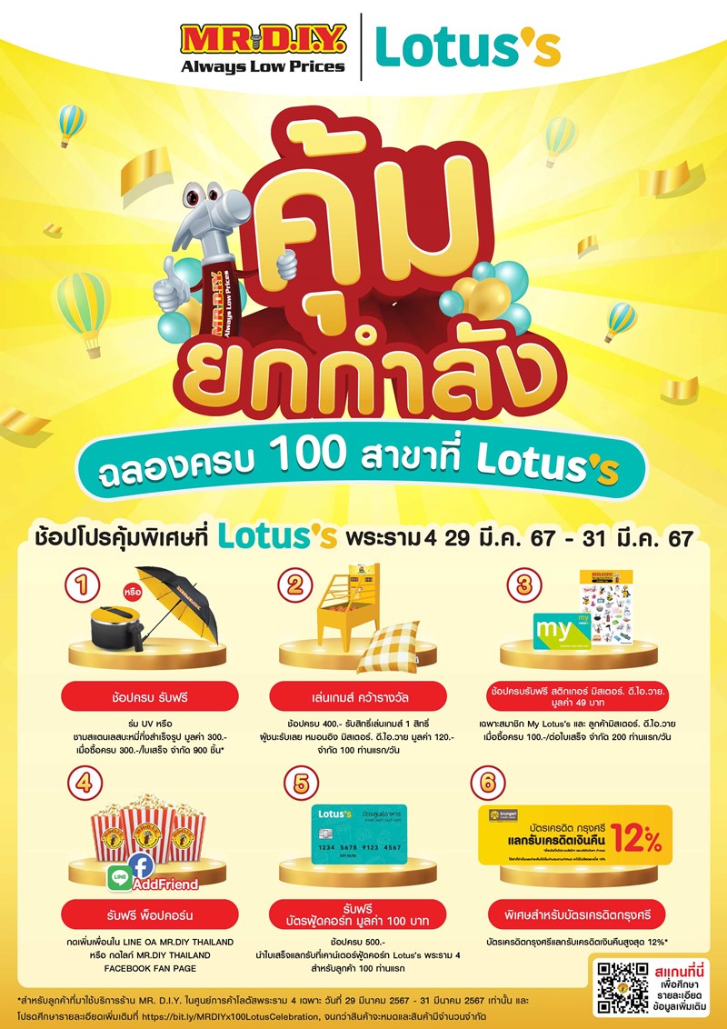 - เมื่อซื้อสินค้าใดก็ได้ ภายในร้านมิสเตอร์. ดี.ไอ.วาย. สาขาที่ร่วมรายการ ครบ 500 บาท ต่อ 1 ใบเสร็จ และนำใบเสร็จจากร้านมิสเตอร์. ดี.ไอ.วาย.ไปแลกรับฟรี บัตรฟู้ดคอร์ทโลตัส มูลค่า 100 บาท จำนวน 1 ใบ ที่เคาท์เตอร์ฟู้ดคอร์ทโลตัส พระราม 4 จำกัดจำนวน 100 ท่านแรกตลอดระยะเวลากิจกรรม