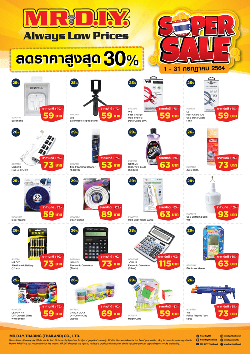 กรุงเทพฯ, 1 กรกฎาคม 2564 – มิสเตอร์. ดี.ไอ.วาย. ผู้ค้าปลีกสินค้าตกแต่ง และซ่อมแซมบ้านรายใหญ่ที่สุดจากประเทศมาเลเซีย จัดโปรโมชั่น Super Sale นำสินค้าอรรถประโยชน์กว่า 30 รายการ มาลดราคาสูงสุดถึง 30% จากหลากหลายหมวดหมู่ ไม่ว่าจะเป็น อุปกรณ์เครื่องมือช่าง ของใช้ในครัวเรือน อุปกรณ์ประดับยนต์ ของเล่น และอื่น ๆ อีกมากมาย โดยมีสินค้า อาทิ โคมไฟ USB สายชาร์จโทรศัพท์ หูฟัง แผ่นรองเตารีด ถาดสแตนเลส ฯลฯ พร้อมสินค้าน่าช้อปภายในร้านมิสเตอร์. ดี.ไอ.วาย. มาเอาใจขาช้อปในช่วงกลางปี ด้วยสินค้าราคาดี คุณภาพโดนใจ แล้วมาพบกับสินค้าโปรโมชั่นลดราคาดี ๆ แบบนี้ได้ที่ ร้านมิสเตอร์. ดี.ไอ.วาย. ทุกสาขาทั่วประเทศ ตั้งแต่ วันนี้ ถึง 31 กรกฎาคม 2564