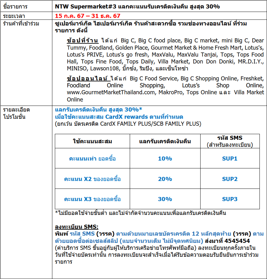 - สิทธิพิเศษสำหรับบัตรเครดิตคาร์ดเอกซ์ และบัตรเครดิตไทยพาณิชย์ ยกเว้น บัตรเครดิต CardX FAMILY PLUS/SCB FAMILY PLUS เมื่อมียอดใช้จ่ายผ่านบัตรแบบชำระเต็มจำนวนที่ ซูเปอร์มาร์เก็ต ไฮเปอร์มาร์เก็ต ร้านค้าสะดวกซื้อ ทั้งที่ร้านค้า และผ่านช่องทางออนไลน์ที่ร่วมรายการ ระหว่างวันที่ 15 ก.ค. 67 – 31 ธ.ค. 67