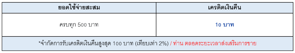 • จำกัดการรับเครดิตเงินคืนสูงสุด 100 บาท (เทียบเท่า 2%) /ท่าน ตลอดระยะเวลาส่งเสริมการขาย