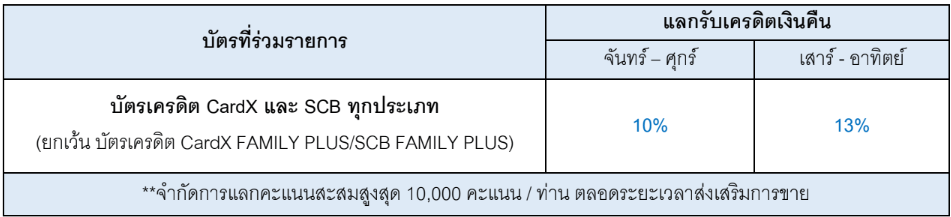 • สิทธิพิเศษนี้สำหรับผู้ถือบัตรเครดิตคาร์ดเอกซ์ และบัตรเครดิตไทยพาณิชย์ ยกเว้นบัตรเครดิต CardX FAMILY PLUS / SCB FAMILY PLUS เมื่อมียอดใช้จ่ายผ่านบัตรแบบชำระเต็มจำนวน และใช้คะแนน POINTX เท่ายอดใช้จ่ายต่อเซลล์สลิป แลกรับเครดิตเงินคืน 10% สำหรับ (จันทร์ – วันศุกร์) และแลกรับเครดิตเงินคืน 13% สำหรับ (เสาร์-อาทิตย์)
