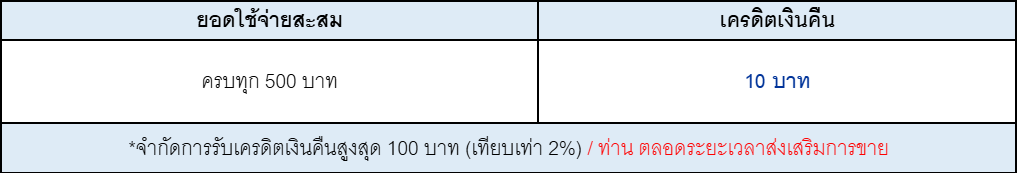 - จำกัดการรับเครดิตเงินคืนสูงสุด 100 บาท (เทียบเท่า 2%) /ท่าน ตลอดระยะเวลาส่งเสริมการขาย
