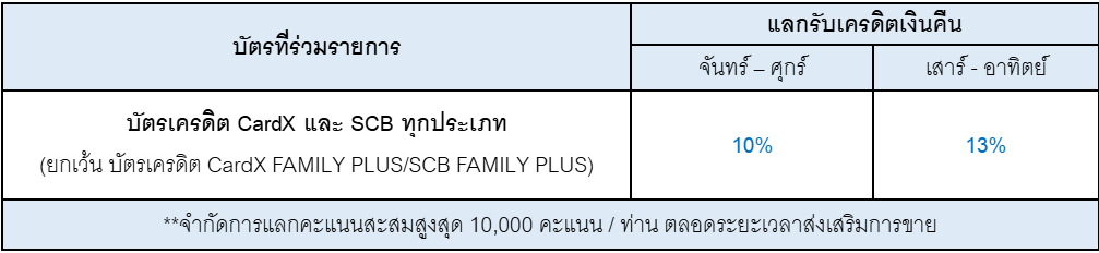 - สิทธิพิเศษนี้สำหรับผู้ถือบัตรเครดิตคาร์ดเอกซ์ และบัตรเครดิตไทยพาณิชย์ ยกเว้นบัตรเครดิต CardX FAMILY PLUS/ SCB FAMILY PLUS เมื่อมียอดใช้จ่ายผ่านบัตรแบบชำระเต็มจำนวน และใช้คะแนน POINTX เท่ายอดใช้จ่ายต่อเซลล์สลิป แลกรับเครดิตเงินคืน 10% สำหรับ (จันทร์ – วันศุกร์) และแลกรับเครดิตเงินคืน 13% สำหรับ (เสาร์-อาทิตย์)