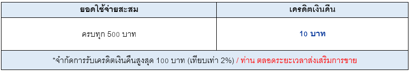 - จำกัดการรับเครดิตเงินคืนสูงสุด 100 บาท (เทียบเท่า 2%) /ท่าน ตลอดระยะเวลาส่งเสริมการขาย