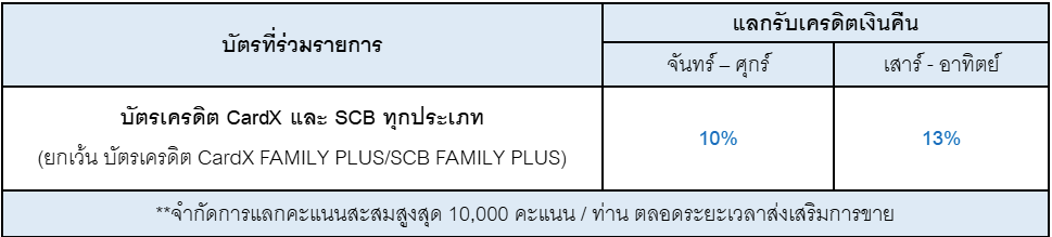 - สิทธิพิเศษนี้สำหรับผู้ถือบัตรเครดิตคาร์ดเอกซ์ และบัตรเครดิตไทยพาณิชย์ ยกเว้นบัตรเครดิต CardX FAMILY PLUS/ SCB FAMILY PLUS เมื่อมียอดใช้จ่ายผ่านบัตรแบบชำระเต็มจำนวน และใช้คะแนน POINTX เท่ายอดใช้จ่ายต่อเซลล์สลิป แลกรับเครดิตเงินคืน 10% สำหรับ (จันทร์ – วันศุกร์) และแลกรับเครดิตเงินคืน 13% สำหรับ (เสาร์-อาทิตย์)