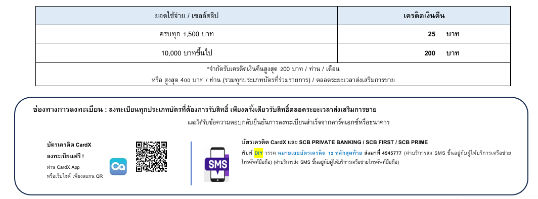 - สิทธิพิเศษสำหรับผู้ถือบัตรเครดิตคาร์ดเอกซ์ และบัตรเครดิตไทยพาณิชย์ทุกประเภท เมื่อมียอดใช้จ่ายผ่านบัตรเครดิตแบบชำระเต็มจำนวนครบตามที่กำหนด รับเครดิตเงินคืน ดังนี้