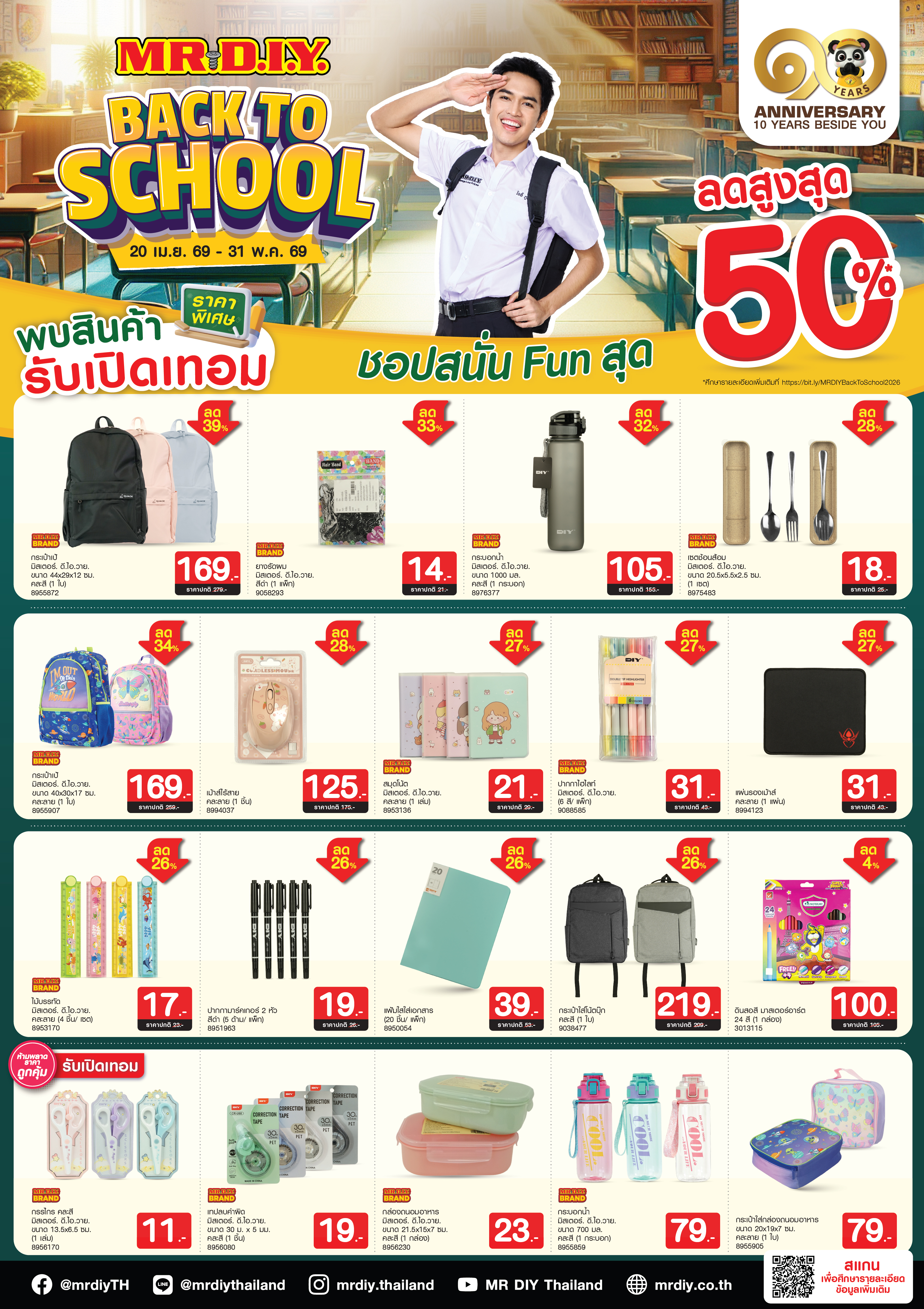 - สามารถเข้าร่วมรายการส่งเสริมการขายนี้ได้ทุกสาขาที่ร่วมรายการ ทั้งนี้ จำนวนสาขาอาจมีการเปลี่ยนแปลงตามตารางการเปิดสาขาของบริษัท โปรดศึกษาสาขาที่ร่วมรายการส่งเสริมการขายนี้ ได้ที่ https://bit.ly/MRDIYBackToSchool2026
