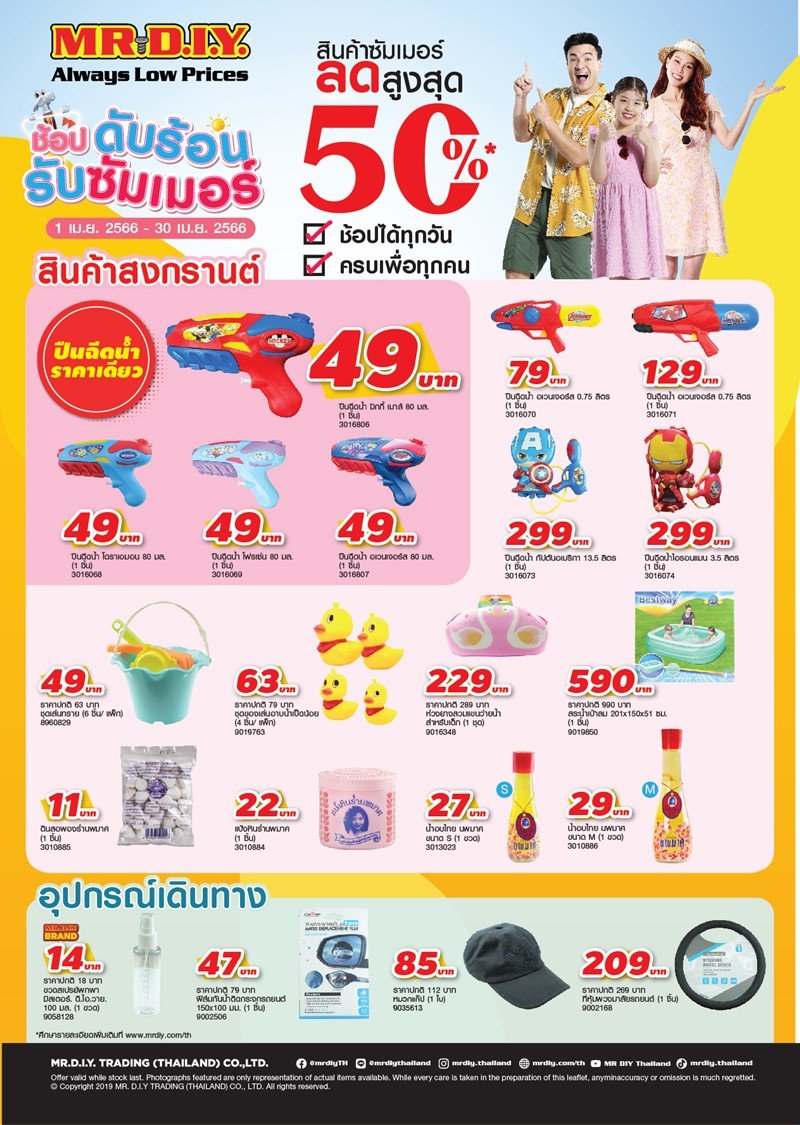 พบสินค้าซัมเมอร์ อาทิ ชุดลำลองสบายๆ รองเท้าแตะ ชุดว่ายน้ำ และแว่นกันแดดสุดชิคในราคาสุดคุ้ม สินค้าสำหรับเตรียมเดินทางท่องเที่ยวในวันหยุดยาว ชุดเล่นทรายสุดสร้างสรรค์สำหรับเด็ก ปืนฉีดน้ำการ์ตูนสุดน่ารักยกทัพทั้งเหล่าการ์ตูนหลากหลายมาให้เลือก เสริมทัพด้วยไอเทมสาดดับร้อนต้อนรับสงกรานต์อย่างขันน้ำกลมสุดคลาสสิคและน้ำอบไทย หรือจะแช่น้ำชนทุกอุณหภูมิร้อนกับสระน้ำเป่าลมพร้อมไอเทมน่ารักๆ ชุดของเล่นอาบน้ำเป็ดน้อย ห่วงยางสวมแขนว่ายน้ำ และสินค้าอื่นๆ ที่พร้อมตอบโจทย์ทุกความต้องการตลอดเดือนเมษายน 2566